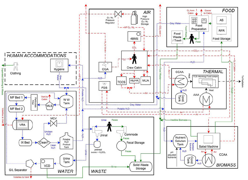 in the cabin and deals with human waste. It includes also shielding against harmful radiation and micro-meteorites.